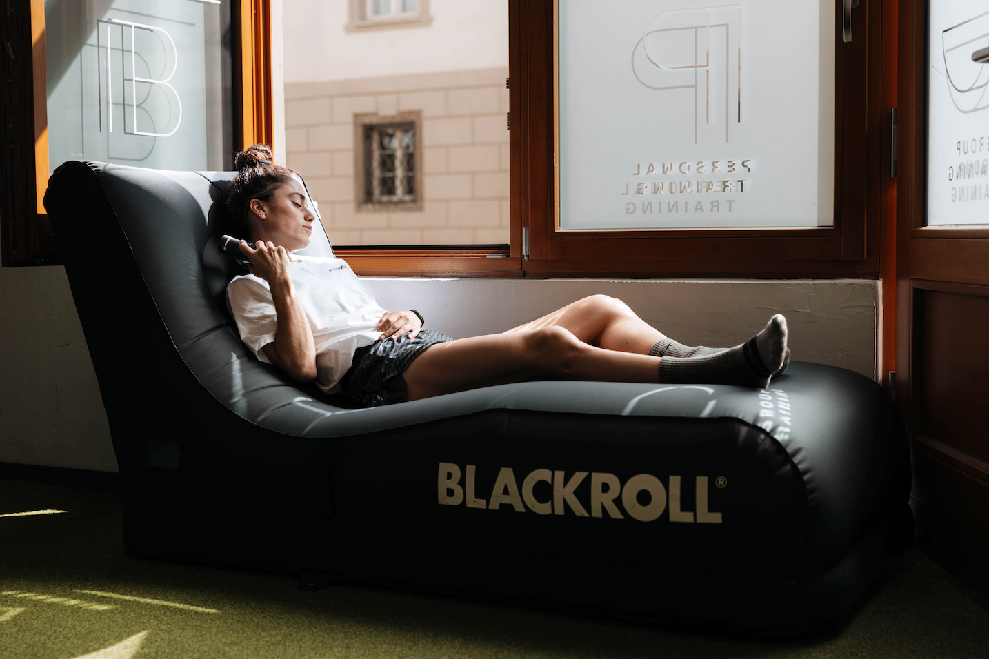 In addition to outdoor use, the AIR LOUNGER can also be set up and used indoors, whether at home or in the sports hall.